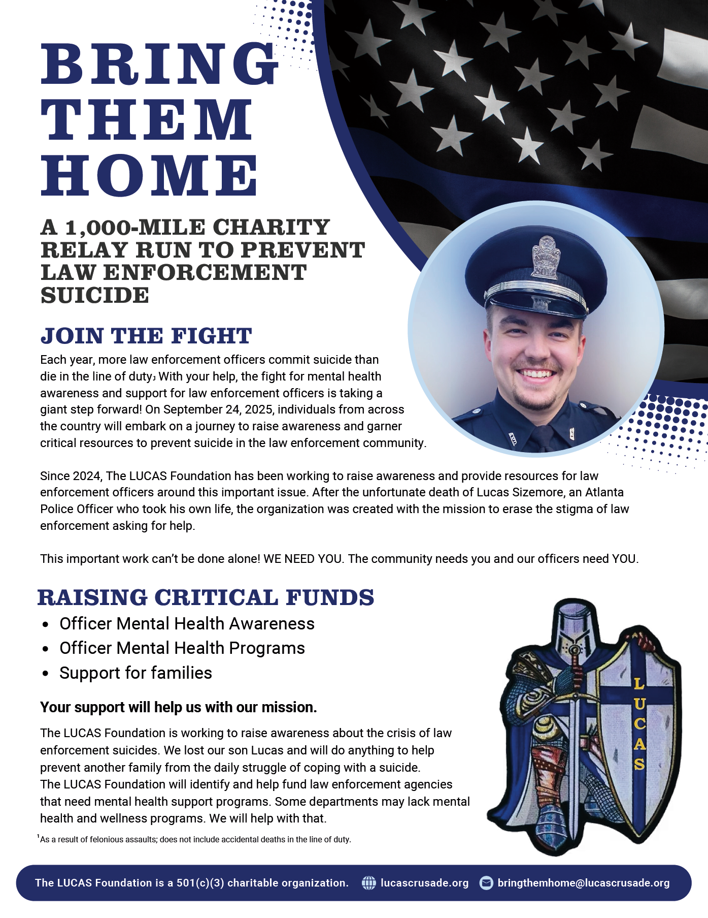 From September 24 to September 30th, 2025, the Lucas Foundation will hold the first ever Bring Them Home Relay for law enforcement; a 1,000 mile journey from Atlanta, Georgia to Detroit, Michigan commemorating Lucas' career and to draw support for officers who face mental adversity in their careers.